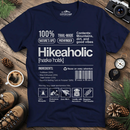 Hikeaholic T-Shirt – Funny Hiking Addict Label Tee